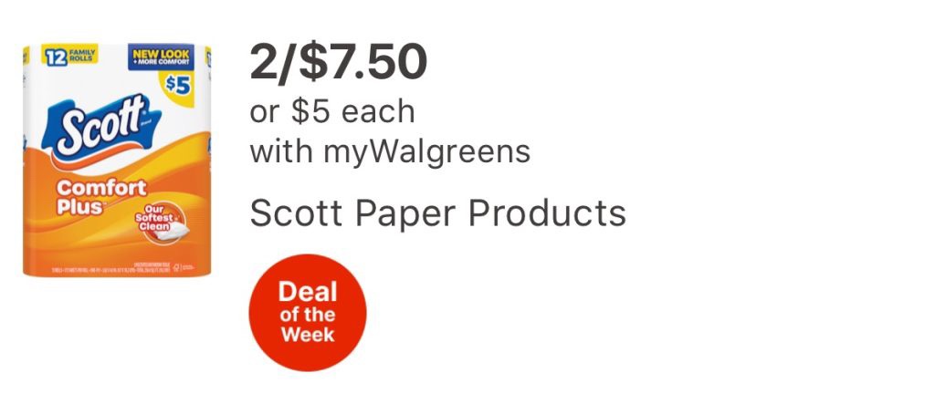 - Buy 1 Scott Comfort Plus Bath Tissue 12-roll pack (marked $5 each at Walgreens).