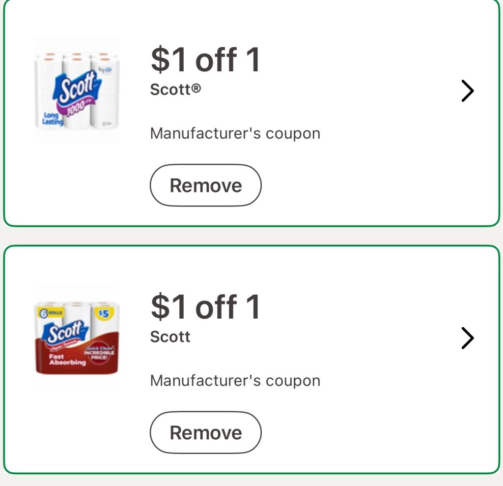 - Second Discount: Clip both available $1 off digital manufacturer coupons for Scott (one for towels, one for tissue) in your Walgreens app savings tab. (Pic below)