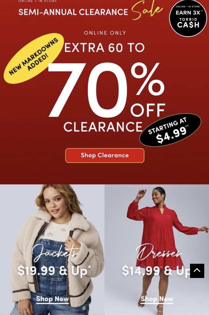 The TORRID Semi Annual Sale is finally here! Take an extra 60%-70% off Clearance! SEE IT HERE