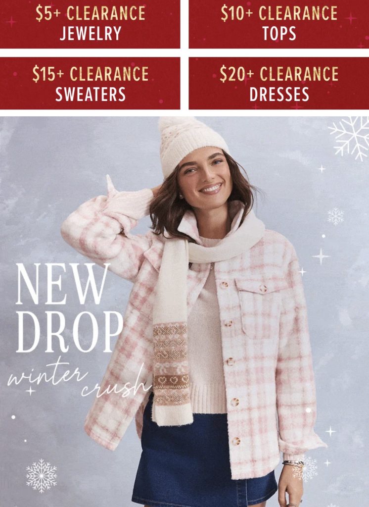 Okay, you have to check out the Francesca’s End of Year Clearance! Prices start as low as $5.00! SEE IT HERE